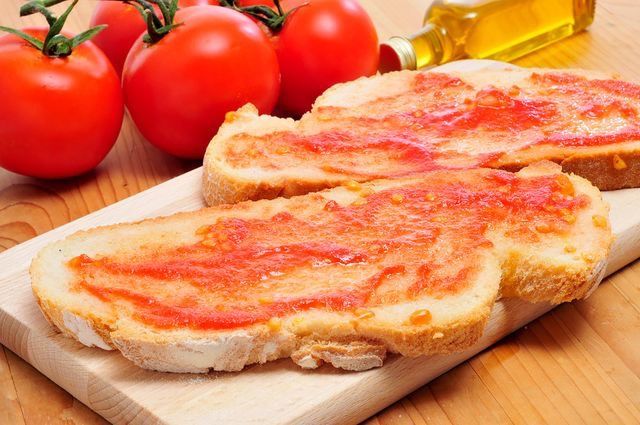 Čti „pa am tomáket“ neboli chleba s rajčetem. Na „pa amb tomaquet“ Katalánci nepoužívají běžná rajčata, ale menší, říká se jim „tomaquet de penjar“. To proto, že se skladují zavěšené jedno na druhém v síťce. Jejich šťáva má sytě rudou barvu a semínka jsou tak jemná, že si jich ani nepovšimnete. V pokojové teplotě prý vydrží až 5 měsíců. Tato rajčata mají tak tenkou slupku, že když je rozkrojíte na půlku a začnete roztírat na chleba, jediné co vám v ruce zůstane, je ta slupka, která se pak vyhodí. Potom stačí chléb už jen pokapat olivovým olejem a posolit, a máme hotovo. No, a když si tedy v Katalánsku objednáte jakýkoliv typ bagety či chleba, ať už se šunkou, sýrem nebo čímkoliv jiným, úplně běžně vám ho pomažou těmito rajčaty. Osobně bych bagetu na jiný způsob asi už nejedla.