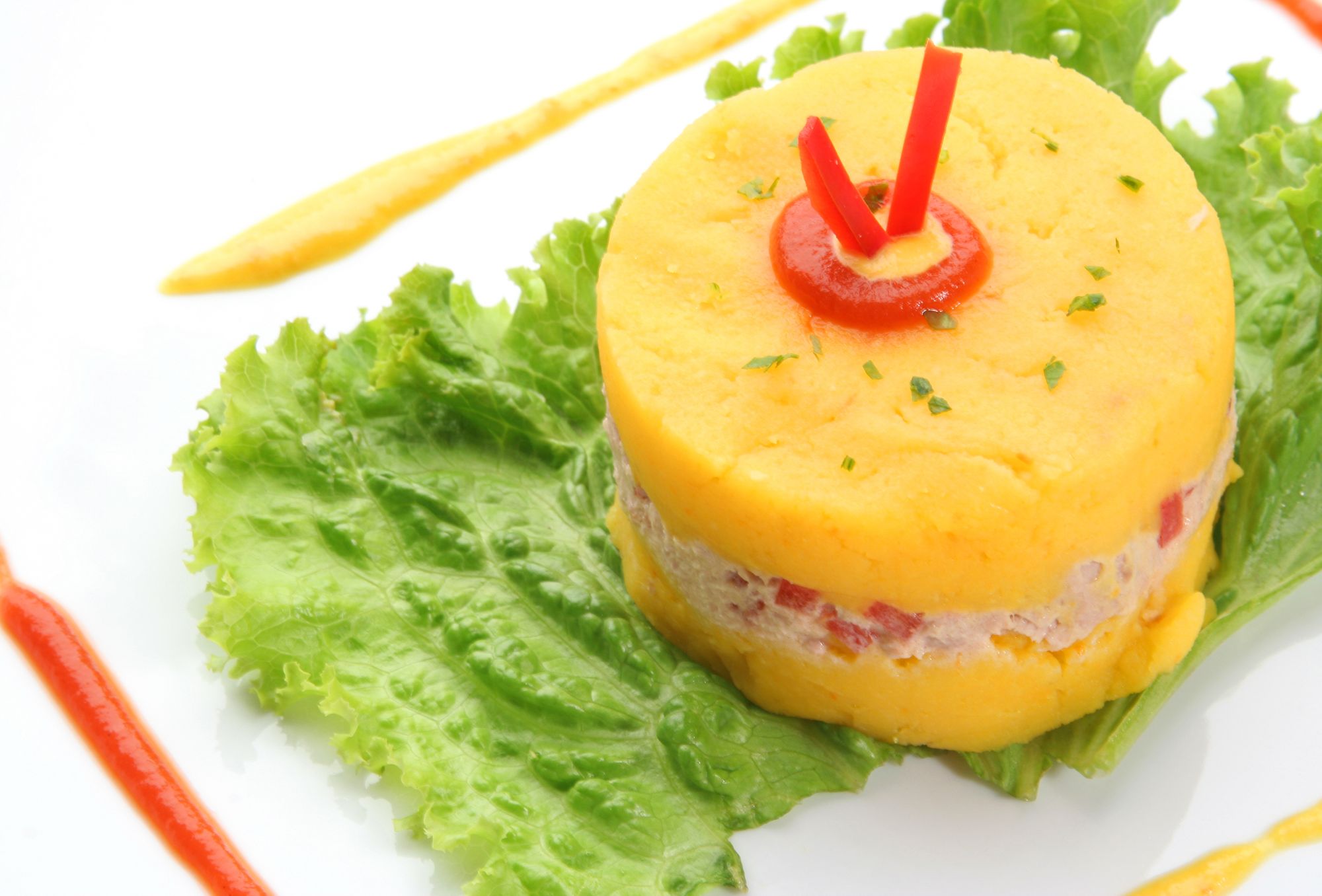 Causa rellena – bramborové těsto s ají amarillo a s různou náplní – tuňákem, kuřecím masem, apod. Podává se často jako předkrm a je to vynikající!