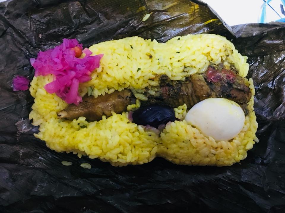 Juane – kuře, rýže, vajíčko a olivy zabalené v listu rostliny kalátea (vypadá jako banánovník), které dodá jídlu specifickou chuť.