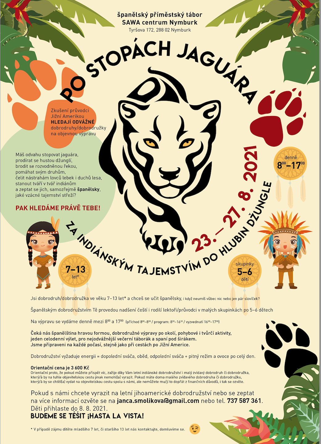 Kdo chce s námi vyrazit po stopách jaguára na jihoamerické letní dobrodružství, nechť pošle přihlášku do 8.8.2021 na email janca.smolikova@gmail.com. Pokud budete mít jakékoliv dotazy, ozvěte se na email nebo telefon 737 587 361. Více informací o táboře najdete na facebooku pod názvem „ŠPANĚLSKÝ příměstský tábor v Nymburce“.